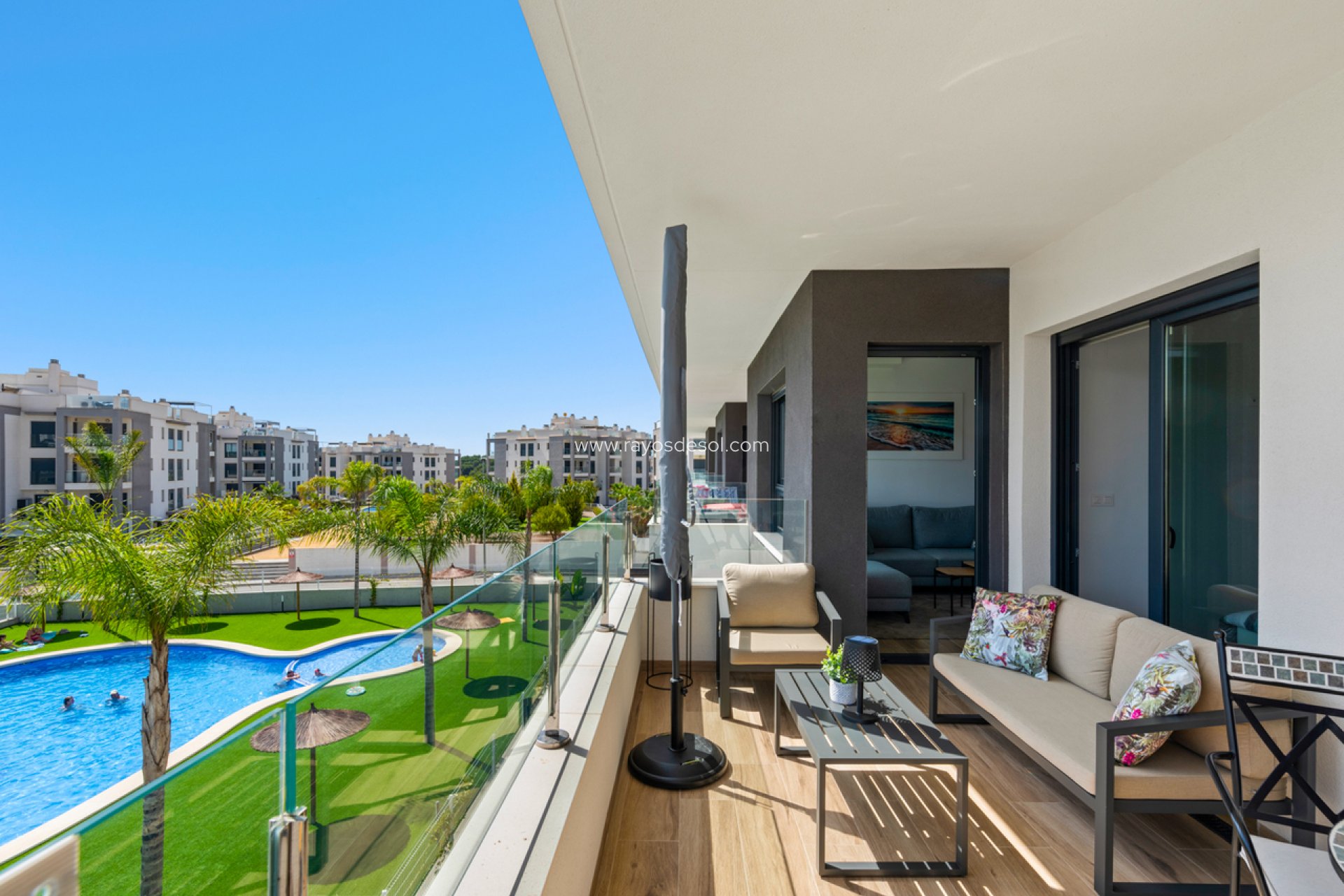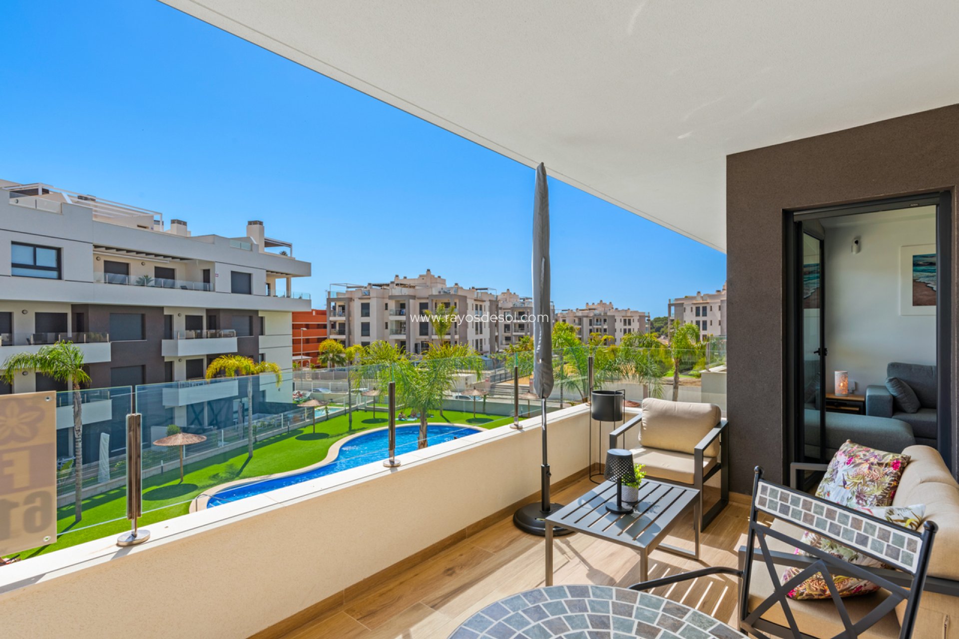 YesThis modern 2 bedroom, 2 bathroom corner apartment on the second floor is situated in Villamartin, Alicante set in a great location only a few minutes walk to all local amenities (restaurants, bars and shops). The fantastic La Zenia beach and La Zenia Boulevard shopping centre is also a 10 minute drive. Villamartin Plaza and Villamartin Golf are less than 4 minutes away. The property is comprised of a spacious lounge area, an open plan kitchen/dining area, electric shutters, air conditioning (hot/cold) throughout the property, a main bedroom with fitted wardrobe and en-suite bathroom with bathtub, a further guest bedroom with fitted wardrobe and a second bathroom with walk-in shower. Patio doors lead out onto a private terrace (with small utility room) to enjoy the sun all day. Private allocated parking space is also included. There is a lovely communal green area with communal swimming pool, petanque zone, children's playground and a beautiful communal park. The Villamartin area is very popular with tourists and most of the population consists of Western European expatriate communities who have settled there in the last 10 years, virtually transforming the village into a modern-looking town. There are also other golf courses nearby and numerous white sandy beaches.