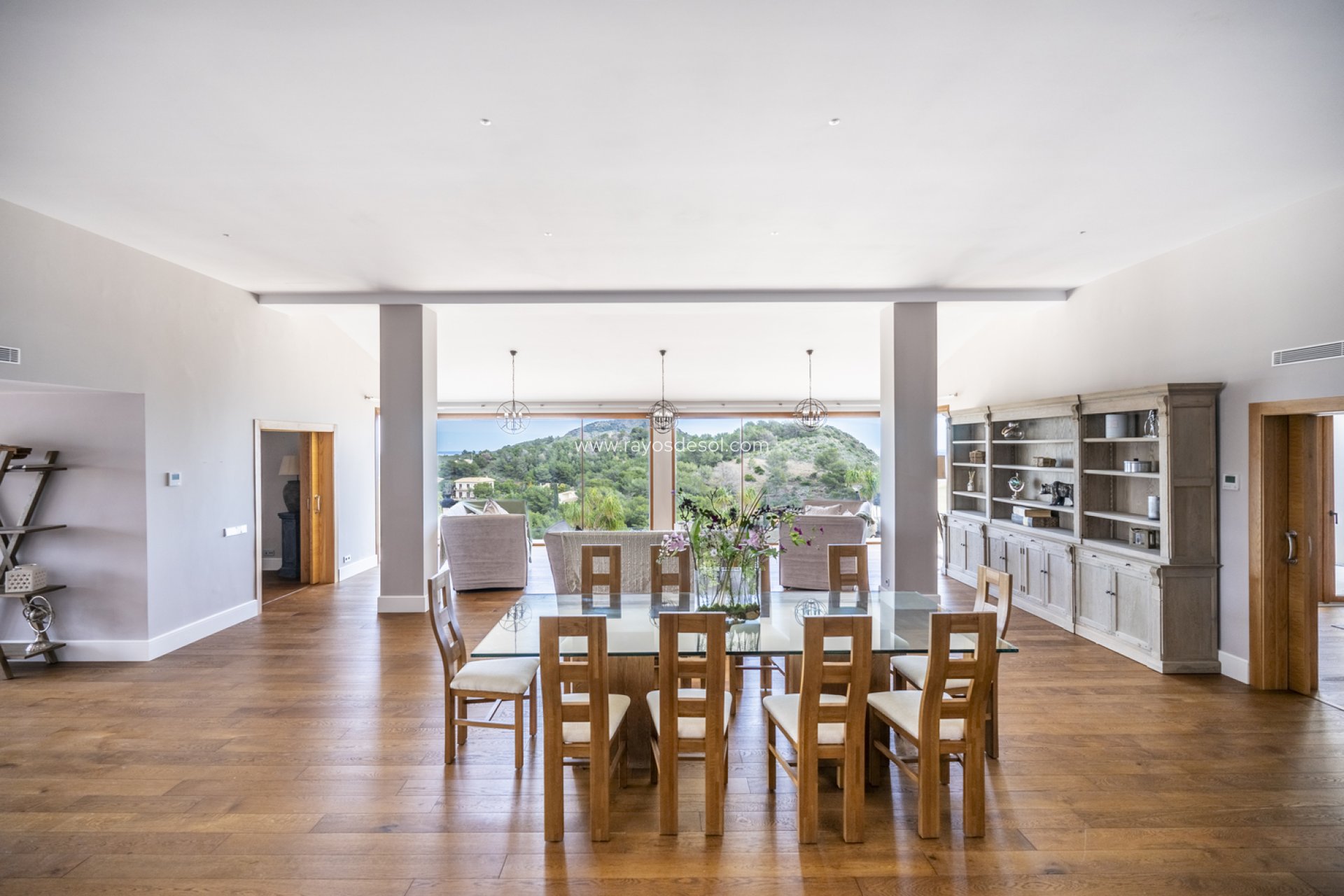 La primera planta se abre a una amplia terraza que envuelve la villa, ofreciendo impresionantes vistas tanto del mar Mediterráneo como de las montañas circundantes. Este espacio exterior es perfecto para tomar el sol, comer al aire libre o simplemente relajarse con una copa de vino mientras se disfruta de la tranquilidad del paisaje.
