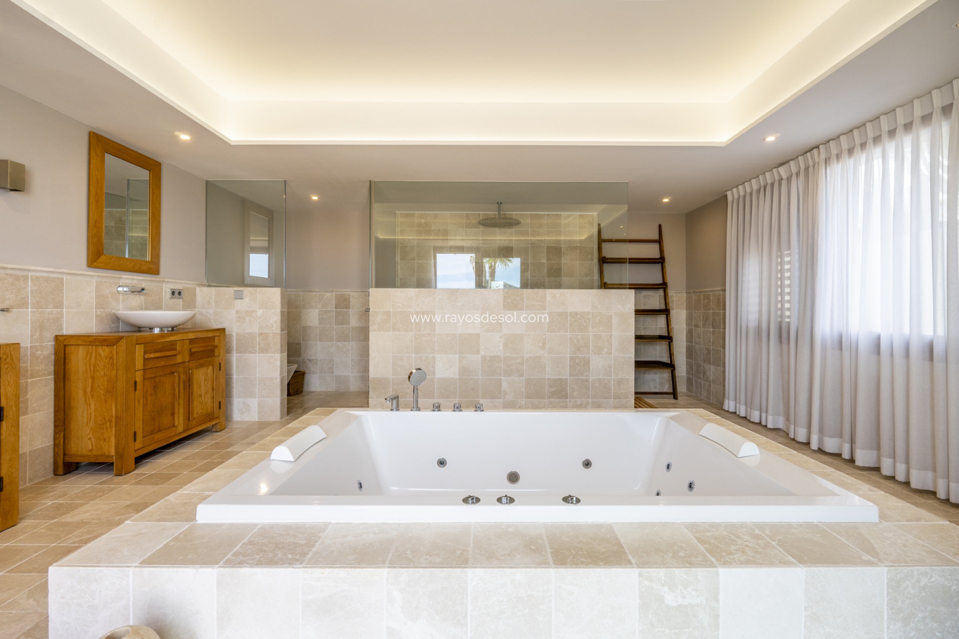 Desde la tercera planta se accede a la joya de la corona de la villa: el oasis exterior. La gran piscina es el lugar perfecto para refrescarse en los calurosos días de verano, con elegantes juegos de agua que contribuyen a crear un ambiente de serenidad y lujo. La zona de la piscina también cuenta con una piscina separada para niños y un jacuzzi, que garantizan la diversión y la relajación de huéspedes de todas las edades.