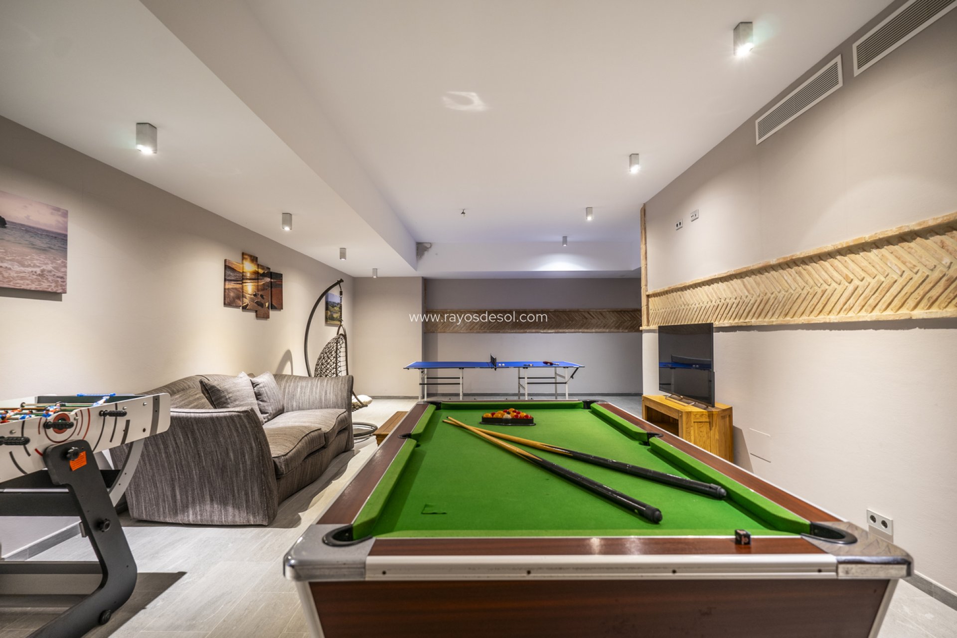 Más allá de la piscina, la zona exterior incluye una cocina totalmente equipada y una zona de barbacoa, ideal para celebrar fiestas al aire libre, barbacoas o comidas familiares informales. Una zona de juegos para niños también forma parte de este paraíso al aire libre, proporcionando un espacio seguro y divertido para el disfrute de los residentes más jóvenes.