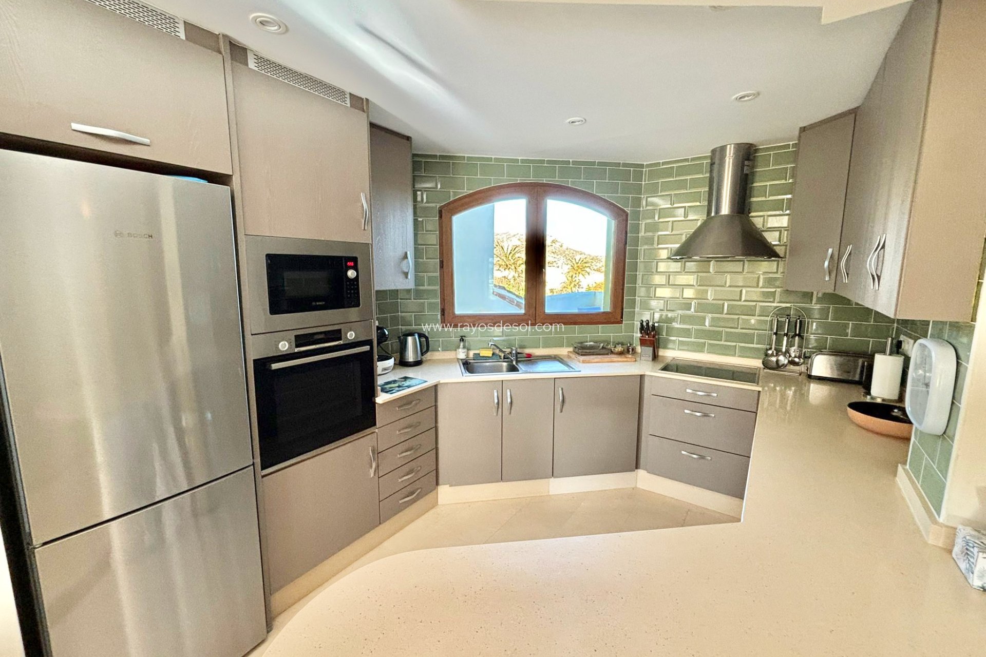 El corazón de este impresionante ático es su amplio salón-comedor de planta abierta. Este espacio está cuidadosamente diseñado para ofrecer una mezcla de estilo y comodidad, con techos altos que realzan la sensación de espacio y ligereza. Una encantadora chimenea sirve como punto focal, añadiendo un toque de calidez y comodidad, haciendo de este el escenario perfecto tanto para veladas íntimas como para recibir invitados. Unas grandes puertas correderas conducen a la terraza delantera, donde las impresionantes vistas de la costa ofrecen un telón de fondo idílico para tomar un café por la mañana, una copa por la noche o cenar al aire libre bajo las estrellas.
